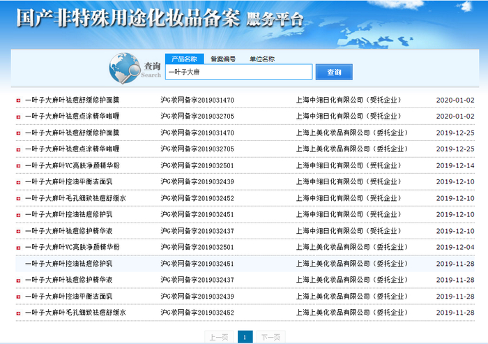 其中,一叶子大麻叶祛痘舒缓修复面膜月销量最高,而在国家药监局官网的备案系统查询“一叶子大麻”,出现了10余种之多以“大麻叶”命名的护肤品。