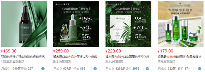 在天猫上搜索关键词“大麻叶”,有面膜、精华、面霜、眼霜、洗面奶等上百款化妆品在售,品牌方面一叶子、溪木源、麻元素等都有着不错的销量。