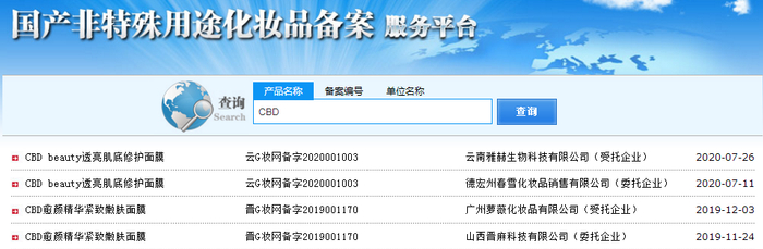 而在药监局备案系统中,有多款名称中含有CBD字样的化妆品已通过备案。由此看来,目前国内关于CBD的使用及宣称规范仍然模糊不明。