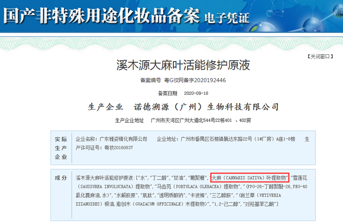 另外,从2019年11月到今年9月份,不到一年的时间,溪木源大麻化妆品在国家药监局的备案共有34条。