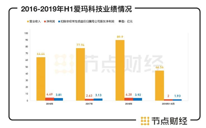 2016—2019年上半年,爱玛科技营业收入分别为64.44亿元、77.94亿元、89.90亿元、44.56亿元,营业收入增速平缓。净利润分别为4.49亿元、2.63亿元、4.28亿元、2.00亿元,利润未见增长。扣除非经常性损益后归属母公司股东净利润分别为3.81亿、3.13亿、3.92亿、1.93亿。