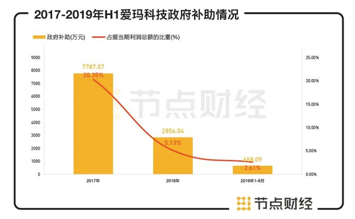 爱玛科技2017-2019年上半年,公司计入当期损益的政府补助为7787.07万元、2856.04万元、658.09万元,占据当期利润总额的比重高达20.35%、5.13%、2.61%。以其2017年业绩计算,爱玛科技同期净利润暴跌至2.63亿元,相比2016年4.47亿元的净利润几近腰斩。如果刨除政府补贴款项,爱玛科技2017年净利润暴跌幅度更为惊人。