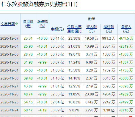 数据显示,截至12月7日,仁东控股融资余额为30.4亿元,占流通市值比例达23.3%。而随着股价大幅缩水,投资者融资买入偿还意愿也逐步退减,12月7日融资买入偿还额仅为991万元,较前一交易日降幅近60%。证券时报·e公司记者关注到,仁东控股的融资盘在8月初尚不足20亿元,11月中旬快速攀升至34亿元,期间股价在介于40-60元,意味着有10几亿的融资盘持仓成本在40元以上。