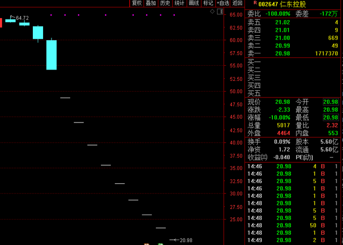 12月4日,在仁东控股第八个跌停板,杨宁(化名)利用华鑫快速通道侥幸逃离,在25.79元/股及时止损。“虽然亏不少,还是很庆幸跑掉了。我之前也是听别人推荐才关注到这只股票,看形态还不错就高位买进了,结果没多久就开始暴跌,现在想想真是悔不当初。”