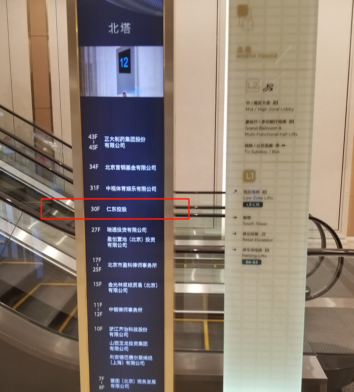 仁东控股位于正大中心北塔30层。从北塔大厅正门进入并乘坐扶梯才可以到达北塔办公区的电梯间。记者在电梯间外的公司指示牌看到,在北塔办公的知名公司有正大制药集团股份有限公司、北京首钢基金有限公司、中视体育娱乐有限公司、仁东控股,此外还有北京市盈科律师事务所以及中银律师事务所等。