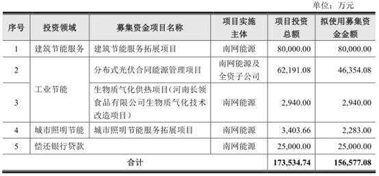 南网能源拟于深交所中小板上市,计划公开发行股份不超过7.58亿股,拟募集资金15.66亿元,其中,8.00亿元用于建筑节能服务拓展项目、4.64亿元用于分布式光伏合同能源管理项目、2940.00万元用于生物质气化供热项目(河南长领食品有限公司生物质气化技术改造项目)、2283.00万元用于城市照明节能服务拓展项目、2.50亿元用于偿还银行贷款。