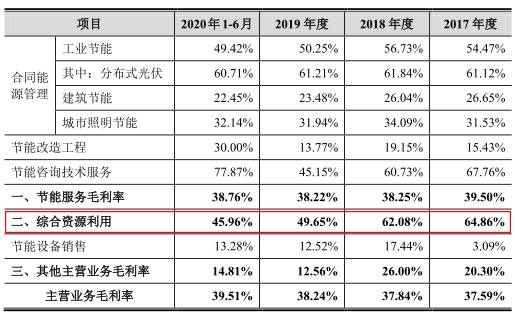 2017年至2020年1-6月,公司综合资源利用毛利率逐期下滑,分别为64.86%、62.08%、49.65%、45.96%。