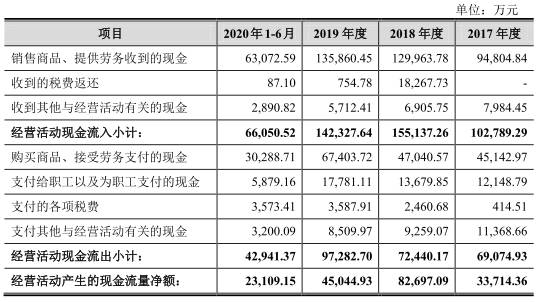 报告期内,公司经营活动产生的现金流量净额分别为2.50亿元、3.37亿元、8.27亿元、4.50亿元、2.31亿元。