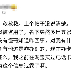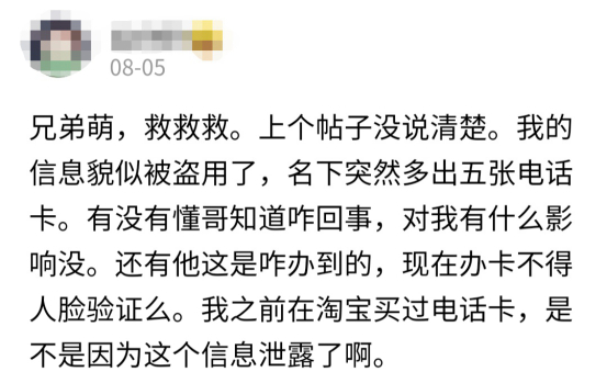 “兄弟萌,救救救。我的信息貌似被盗用,名下突然多出五张电话卡,有没有人知道咋回事,对我有什么影响没?”2020年8月的一天,一位名叫“bit999”的网友在贴吧上发出了这样一条求助帖。