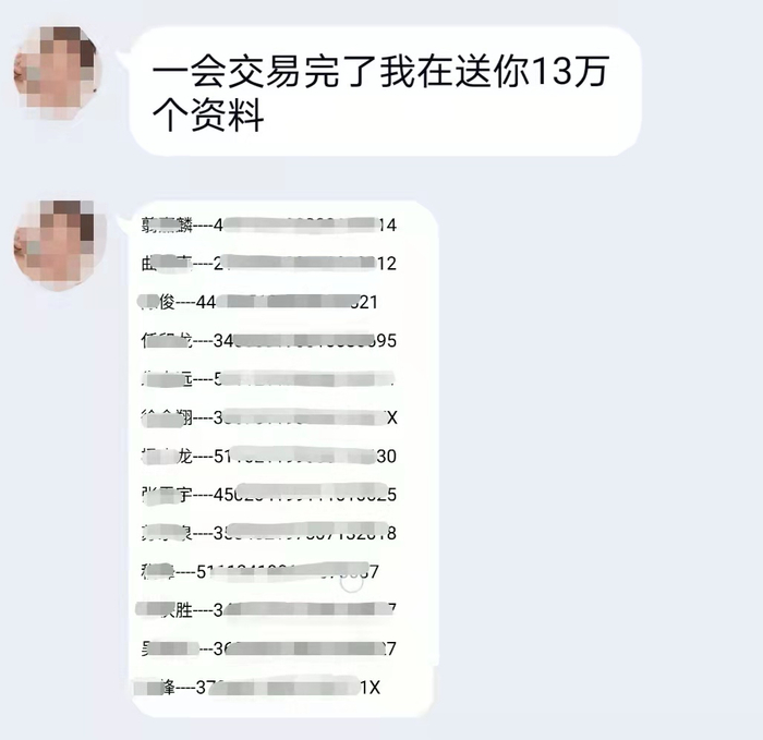 据他介绍,自己手中目前总共有5000多套“高质量料子”,买断(其不再转卖他人)2元一套可验货,不买断5000套则只需200块,还可外送13万个“姓名+身份证号”信息,且除微信实名不能再用,其他App的通过率可以达到95%。