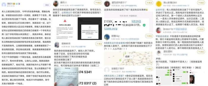 这种情况并非个例。早在2019年10月,就有网友发现自己在没用过某电商平台的情况下,被另一个手机号占用了本属于自己的实名信息,并在该平台上留有4000多元的逾期借款。2020年8月,又有网友发现自己的身份信息被盗用注册了滴滴顺风车,且账号被永久封禁。同月,有网友在微博称,自己的身份信息被人冒用进行网贷,已被连续打了两天的催款电话。