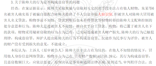 另一份判决书显示,男子陈某在2019年下半年,从6名被害人处骗得了相应个人信息及人脸识别,并在被害人不知情的情况下,冒用他们的身份信息进行网络贷款、购物并占为己有,累计侵占财产14.58万元。