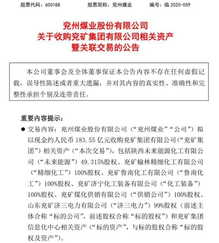 兖州煤业日前发布了拟以现金约183.55亿元收购控股股东兖矿集团的7项相关资产的公告。其中兖矿鲁南化工有限公司(简称“鲁南化工”)是交易标的的主要资产之一。公司收购鲁南化工旨在延伸产业链,实现业务协同发展。