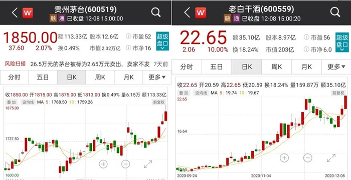 白酒股最近持续爆发,周二(12月8日)全线上涨,贵州茅台、老白干酒股价携手创出历史新高。