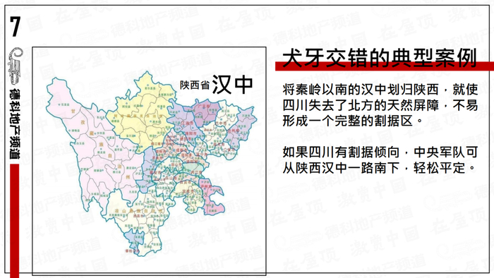 举一个你可能听说过的例子:秦岭以南就是四川,但秦岭以南的汉中划给了陕西省,因为汉中是四川的北大门;一旦四川有割据的倾向,中央军队可以直接从陕西省的汉中一路南下,就能轻松平定。
