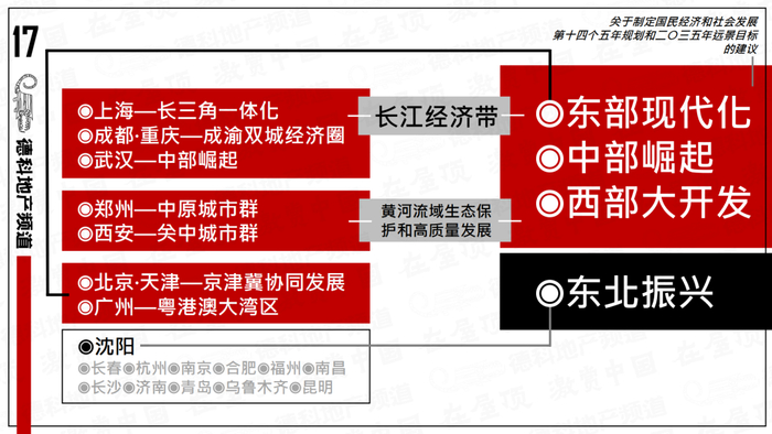 所以,现在这 9 个国家中心城市都跟东部现代化、中部崛起、西部大开发有关系。再看「东北振兴」这一块,现在是没有中心城市的。