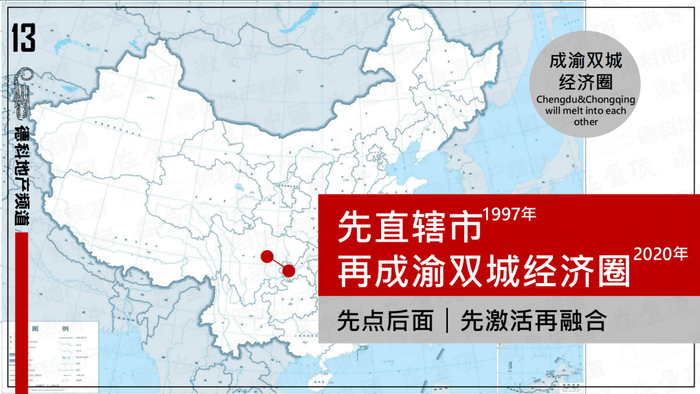 这差不多就是「先点后面」的方法论,先把重庆激活得跟成都一样厉害,然后再融合。也就是:先设直辖市,再做成渝双城都市圈。
