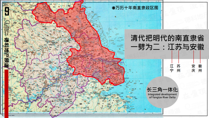 所以,长三角一体化,其中一个功能就是为了解决清朝遗留下来的问题——把安徽省跟江苏省一劈两半的问题。所以长三角一体化不止是江浙沪的事情,必须带上安徽一起玩。