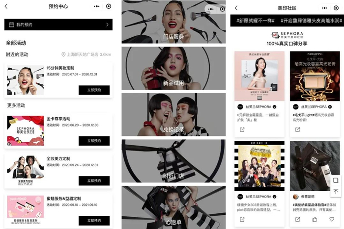 丝芙兰的数字化体验,首先把它放在了科技尝鲜和社交互动的私域位置上。除了科技试妆、推出微信小程序在线预约美妆服务,丝芙兰还在2019年与腾讯智慧零售合作,将丝芙兰的官网与腾讯小程序进行有效的结合,打造了一个社交性电商体系,加大了社交赋能的效用,如通过会员分享,领取小样。