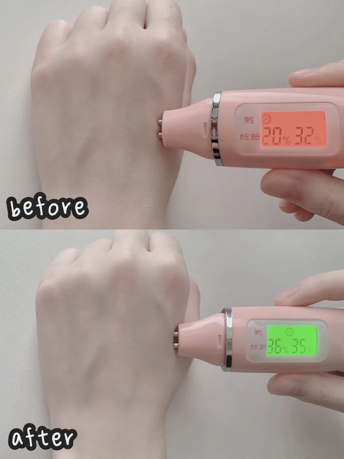 涂之前用水份测试仪测出来手背的水份和油份是20%:32%,涂抹1分钟后再测,水份和油份变成了36%:35%。
