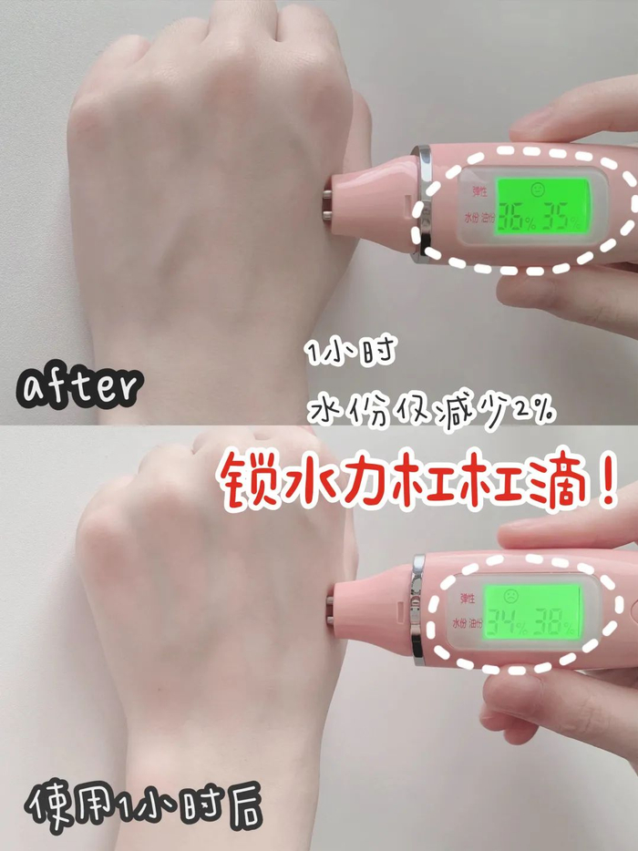 小编的左手手背在涂抹完面霜1小时后,再用水份测试仪测试,水份从36%降到了34%,只减少了2%。