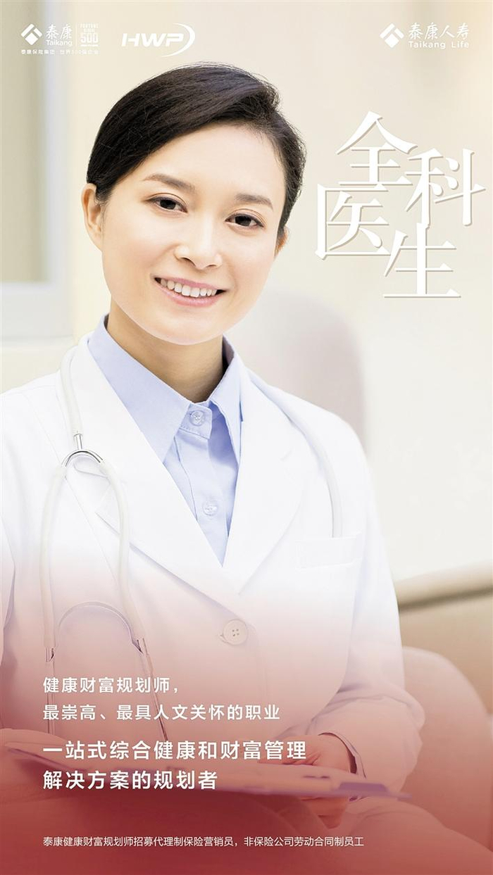 深圳二甲医院消化科资深医生肖海,2019年加盟泰康后,目前已独立管理一个团队。肖海认为健康财富规划师与医师一样伟大,“医生解决是个体的病痛,而健康财富规划师,横跨健康、财富、养老,从个体到整体家庭的前置性科学安排,使得客户实现健康及财富‘立体化’的幸福人生。”