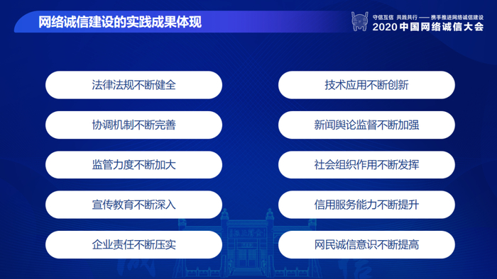 2020年12月7日,以“守信互信 共践共行——携手推进网络诚信建设”为主题的2020中国网络诚信大会在山东曲阜尼山圣境举行。本届大会由国家网信办、国家发展改革委、商务部、市场监管总局和山东省人民政府指导,中国网络社会组织联合会、山东省网信办主办。中央宣传部副部长,中央网信办主任、国家网信办主任庄荣文,山东省委书记、省人大常委会主任刘家义,国家发展改革委党组成员、副主任连维良,市场监管总局党组成员、副局长孙梅君,商务部党组成员、部长助理任鸿斌出席开幕式并致辞。中央网信办副主任、国家网信办副主任盛荣华主持开幕式。