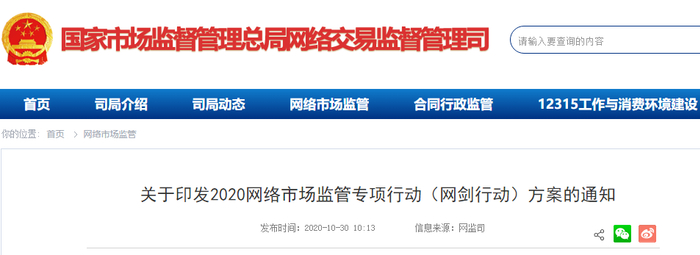 10月30日,国家市场监督管理总局网络交易监督管理司印发《2020网络市场监管专项行动(网剑行动)方案》,网络市场监管部际联席会议各成员单位决定于10-12月联合开展网剑行动,持续推进《电子商务法》贯彻落实,严厉打击网络市场违法行为。