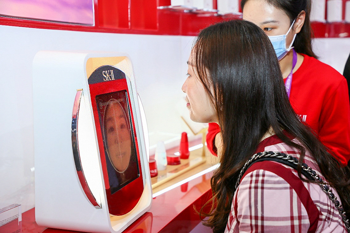 在这一次进博会上,你不难看到SK-II与其他品牌的不同之处。SK-II展示了它的创新成果,例如首款采用人工智能技术的肌肤自测仪MAGIC SCAN。它聚焦眼部、脸颊和唇部三个面部核心区域,无需仪器接触肌肤即可完成扫描。在3分钟之内,让消费者了解自己的肌肤,检测肌肤变化并评估肌肤的稳定度,帮助消费者更了解自身的肌肤优势与潜力。