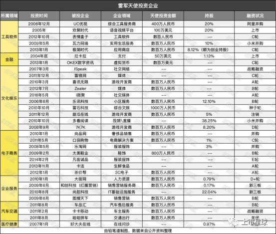 从2004年开始至今,雷军以天使投资人的身份投资的项目有32个,其中超过80%主要发生在2011年之前。据不完全统计,这些项目中有2个公司上市,3个登陆新三板,2个被小米并购,1个被阿里收购,另外9个项目走到了C轮及以后。