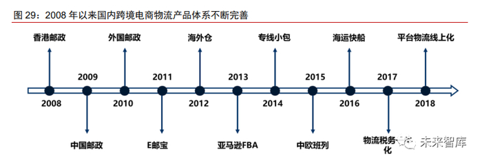 与传统外贸物流模式有显著区别的 B2C 跨境电商出口物流的发展,也持续催生了不 同的物流解决方案。2008 年以来为满足多样化的跨境电商物流需求,跨境电商物流产品 持续不断完善及丰富。