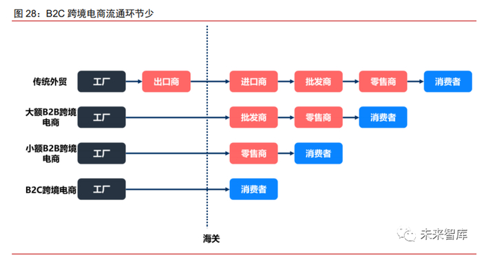 而对于 B2C 跨境电商物流,1)其物流过程覆盖国内-揽收、跨国端-干线、进出口-关 务、海外段-海外仓配等环节,流程环节更多;2)其物流配送需求直链 C 端消费者,因此 相比传统外贸以及 B2B 跨境电商,B2C 跨境电商物流碎片化、小批量、高批次,物流服 务难度大大提升;3)由于电商卖家数量众多且分布各地,这对物流企业的销售网络团队 及前端揽货响应能力都提出了较高要求。