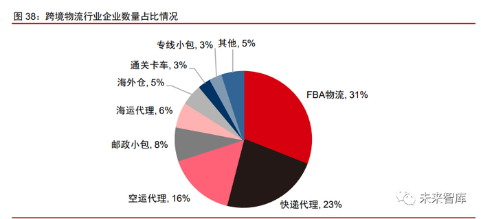 2) 并非所有的出口物流环节都由国内物流企业提供。由于跨境电商进口物流链接不 同国家,对于目的国的尾程派送一般由目的国物流商负责配送,这个环节是国内 物流企业无法获取的,因此我们假设 3/4 的跨境电商出口物流市场可由国内物流 企业经营(也适用进口跨境电商物流市场空间测算)。