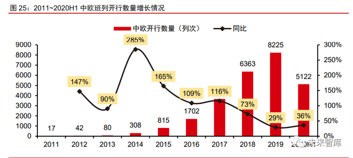 中欧班列早期开通的是渝新欧线路,后续不断发展,截止 2020 年 2 月底,已经开通 了近 30 条班线。中欧班列也从最开始主要承接大宗货物运输到现在跨境电商运输货物占 比快速提升。中欧班列的价格和时效是介于空运和海运之间,其在外贸旺季的时候,可作 为对市场运力的有效补充。随着中国对一带一路的大力推广,同时一带一路沿线基础设施 的不断完善以及中欧跨境电商市场的快速发展,中欧班列将持续保证良好增长趋势。