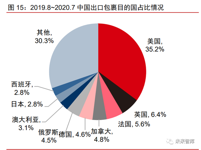 中国跨境出口电商发展领先全球,使得中国跨境电商物流行业市场规模也要明显高于其他国家。由于中国制造的产品性价比在全球极具竞争力,并且中国产品的生产制造供应 链稳定性要好于其他国家(疫情期间稳定性的优势更加明显),因此中国出口跨境电商的 发展要领先其他国家,也使得中国跨境电商出口物流需求也在全球占主导位置。2019.8~2020.7 全球总的跨境电商包裹中(跨境电商物流中的一种模式),中国发出的包裹 占比 60%,遥遥领先其他所有国家。同时在中国发出的包裹中,中国发往美国的包裹最多, 占比超 1/3,发往英国和法国的包裹占比分别排名第二和第三。