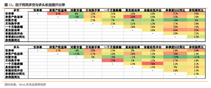 从多空与多头的两两配对提升效果可以看到,部分的因子组合能够获得较高的多空收益率提升,多头的提升参考意义更大,能够帮我们建议有效的主动量化策略基础框架。例如,缩量下跌(非流动性冲击与一个月涨跌幅,月均换手率与一个月涨跌幅),高盈利低波动(ROE与真实波动率)等等。