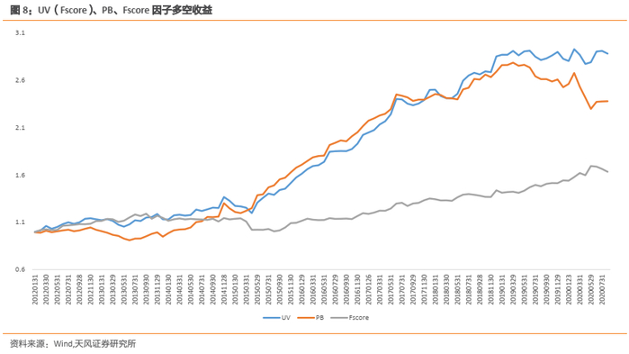 在此我们先以Fscore作为判断基本面(Fundamental)的指标,其中PB与Fscore分别为行业市值中性化后的PB因子与Fscore打分因子。可以看到经过Fscore修正后的UV因子表现。可以看到相对于原始的PB因子,UV因子稳定性显著上升,并且在2012年,2019-2020年表现明显强于PB因子,2019年以来也没有出现PB因子类似的收益大幅滑坡。