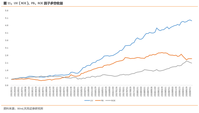 不过值得注意的是,根据这样的方式构建的UV因子,事实上在纳入PB与ROE的 alpha模型中已经被应用了,区别只是在大多数的多因子模型中两者的配比权重会根据过去一段时间的表现来赋权,没有首先将两个因子合称为一个因子。但如果因为其中一个因子表现历史表现波动较大,或超额收益不高而剔除出alpha因子列表,那最终会影响到估值因子与基本面因子的复合效果。