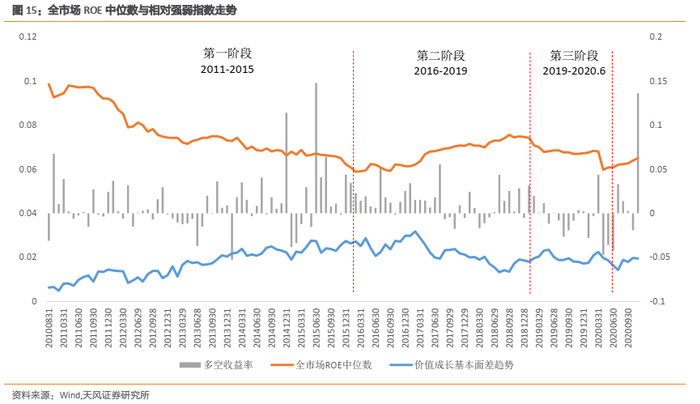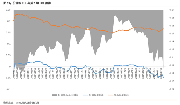 我们根据中性化后PB值对全市场股票分为5组,其中PB最低的定义为价值组,PB最高定义为成长组。进而,我们分别计算价值组和成长组ROE中位数,作为衡量其基本面变化的依据。