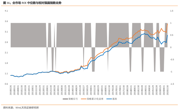 1、宏观角度,我们用全市场ROE中位数6个月均线来判断其趋势性,当前值高于6个月均线时,趋势上行,当前值低于6个月均线时,趋势下行;