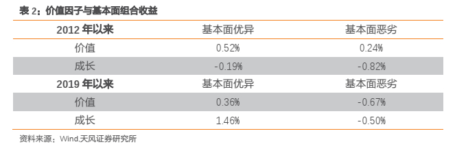 我们将价值因子与基本面构建2*2组合,其中价值中基本面优异组合与成长组合中基本面恶劣组合代表着估值与基本面不匹配的组合,而价值中基本面恶劣组合与成长组合中基本面优异组合代表着估值与基本面相吻合的组合。