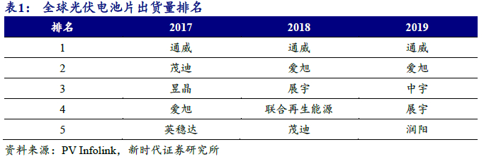 头部专业化电池片企业出货量实现快增长。通威2017-2019年电池片出货量分别为,连续三年行业出货第一。2018年下半年应用领跑者带来大量双面高效PERC电池片的需求,爱旭也因为产线的提早转换,以双面电池片出货1.4GW成为双面电池片的最大供应商,远超其他电池片厂家。