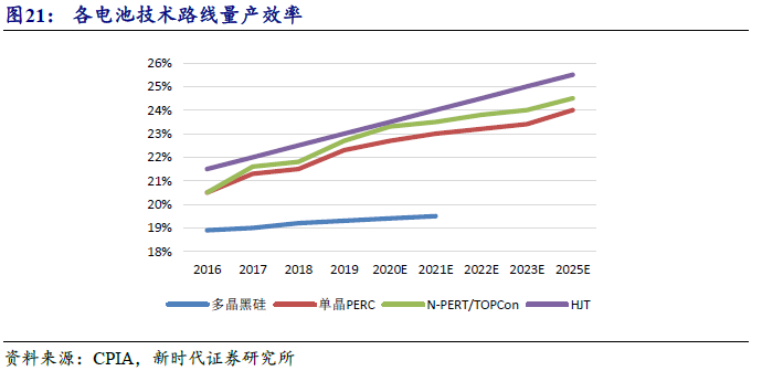 根据CPIA 预测,未来五年各种技术路线电池片的转换效率仍将持续提升,到 2025年PERC单晶、N-PERT 、TOPCon 、HJT 、IBC电池的平均转换效率将分别达到24.0%、24.5%、24.5%、25.5%、25.5 %。目前短期电池片龙头企业的单晶PERC量产效率预计将提升至23%,性价比优势依然明显。目前,新技术HJT 、TOPCon 由于成本较高、技术难度大以及与现有产能不兼容等问题,仅用于少数户用市场;而 IBC电池则仍处于研发阶段,国内尚未实现量产。