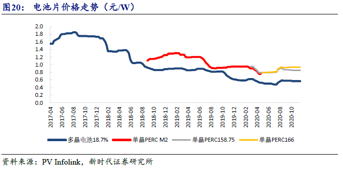 7月份由于新疆硅料厂事故频发,加之新疆疫情出现反复导致运输受阻,硅料供应短缺,产业链价格持续上调,截至8月31日G1电池片均价落在0.88元/W、M6均价0.92元/W。电池片9月份需求旺盛,价格没有松动。2020Q4 166mm以上尺寸供应偏紧,因为国内投标中70%~80%为166mm,预计166mm电池片的毛利率在未来2~3个季度可以维持。