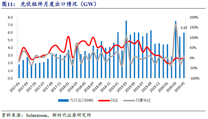 新冠疫情影响小于预期,2021年预计全球装机达到150GW。2020年年初以来,新冠疫情(COVID-19)在全球范围内爆发,部分国家和地区装机延缓、物流及货物清关受阻,以及随之而来的订单延迟交付及后续订单的推迟。但从实际情况看,疫情的影响小于预期,3-4月份国内组件出口依然强势,3月份组件出口7.49GW(同比+167.4%)、4月份组件出口5.46GW(同比-4.7%),均好于市场预期。