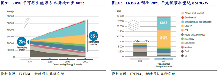 光伏渗透率还有10倍空间。根据IRENA预测,到2050年光伏渗透率将达到25%,相比当前渗透率提升10倍,预测到2050年光伏装机量将达到8519GW,而截至2019年底全球光伏累计装机量仅580GW,光伏还有接近8000GW的装机空间,平均每年装机量约378GW。