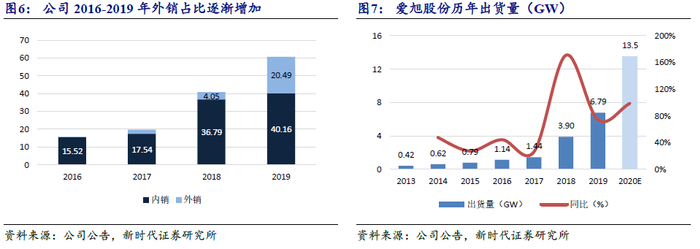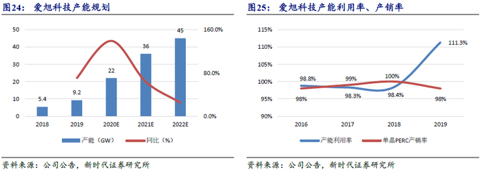 专业电池片厂商,单晶PERC电池龙头。爱旭科技成立于2009年,专业从事太阳能电池的研发、生产和销售,拥有业内领先的PERC电池制造技术和生产供应能力,2019年借壳ST新梅上市A股。公司目前拥有广东佛山、浙江义乌和天津三大高效PERC电池生产基地,我们预计36GW单晶PERC电池2021年Q1将达产。
