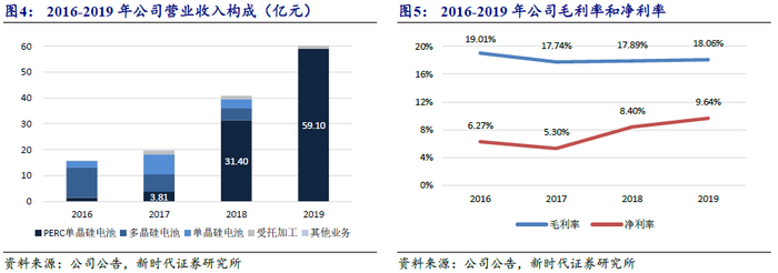 2019年单晶PERC营收占比97.5%,贡献毛利占比95%。16-19年期间公司优化产品结构,逐步退出多晶电池市场并大幅增加单晶PERC电池出货,销售毛利率稳中有升。公司营业收入构成由2016年的以多晶硅电池为主(占比74.6%)逐步切换为2019年的以单晶PERC电池为主(占比97.5%)。公司综合毛利率维持18.2%左右,属行业领先水平。盈利能力逐步改善,海外高毛利地区销售占比逐年增加。公司2016年外销占比仅为1.6%,至2019年公司的外销占比已提升至33.8%,海外高毛利地区销售占比增加提升公司整体盈利能力。