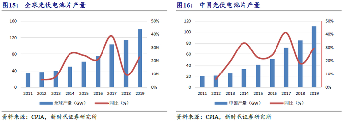 全球电池片产能、产量扩张迅速,中国厂商占比近八成。2019年全球电池片产能为211GW,产量达140GW,同比+22.8%;2019年我国电池片产能为164GW,产量约为108.6GW,同比+27.8%,电池片产量超过2GW的企业有20家。2019年按产能排序,前八厂商分别为通威、天合、隆基、晶澳、晶科、阿特斯、爱旭、韩华。其中通威、爱旭是专业电池厂,效率、成本领先;其余6家为一体化厂商。