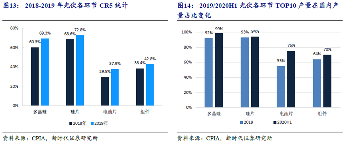 电池片环节格局较为分散,集中度有望进一步提升。据我们统计,2019年光伏各环节Top5集中度分别为多晶硅69.3%(+9pct),硅片72.8%(+4.2pct),电池片37.9%(+8.4pct),组件42.8%(+4.4pct)。相比于其他环节,电池片格局较为分散,2019年CR5仅占37.9%;产能、出货第一的通威2019年市占率仅为11.2%,CR10仅为60%。疫情加速行业产能出清,龙头企业加速布局,未来电池片行业集中度还有较大提升空间。